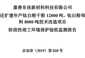 公?? 示??? 根據(jù)《國務(wù)院關(guān)于修改〈建設(shè)項目竣工環(huán)境保護管理條例〉的決定》(國務(wù)院令第682號),以及環(huán)保部《關(guān)于發(fā)布的公告》(國環(huán)規(guī)環(huán)評[2017]4號),現(xiàn)將嘉善東佳新材料科技有限公司遷擴建年產(chǎn)鈦白粉干粉12000噸,鈦白粉母料8000噸技術(shù)改造項目階段性竣工環(huán)境保護